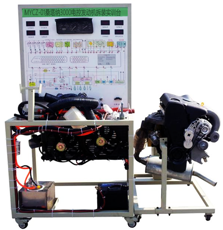 拆装翻转台架由电控汽油发动机总成和可做360度翻转的发动机拆装架组成,运行检测控制台由控制面板、发动机电控单元、冷却系统、供油系统、蓄电池等组成;