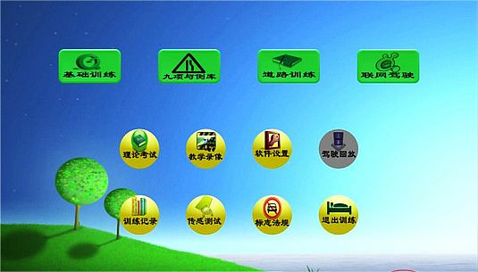 软件主界面如上图所示,界面上有"基础训练"、"九项与倒库"、"道路训练"、"联网驾驶"、"理论考试"、"教学录像"、"软件设置"、"驾驶回放"、"训练记录"、"传感测试"、"标志法规"、"退出训练"。