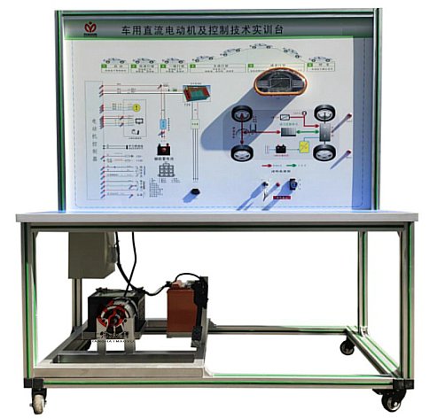 检测控制面板(装有各种检测端子,1448×940mm彩色电路图和工作原理示意图)、组合仪表、点火开关、电机控制器、车载充电器与充电接口、DC-DC转换器、锂动力电池组、电动车电机(交流异步电动机)、刹车开关、档位开关、油门控制装置、大电流继电器、电源总开关、急停开关、辅助蓄电池(12V45AH)、一体化全铝合金型材搭建的移动台架(1500×700×1700mm (带自锁脚轮装置,带安装检测端子的原理面板,面板1448×940mm)、设备操作说明书。