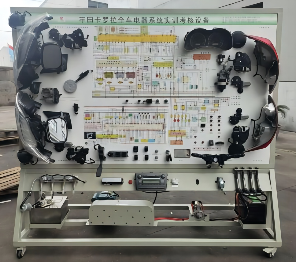 丰田卡罗拉全车电器实训台采用丰田卡罗拉全车电器实物为基础,展示灯光系统、仪表系统、点火系统、起动系统、充电系统、发动机电控系统、喇叭系统、电动车窗系统、电动门锁系统、雨刮系统、音响等各系统的组成结构和工作过程