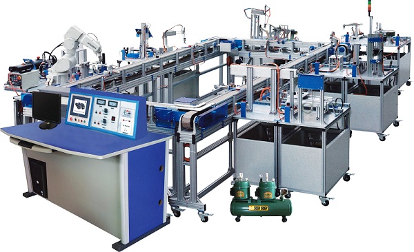 实训装置是一种典型的环形柔性自动生产线,它由供料检测单元、操作手单元、加工单元、图像检测单元、安装单元、搬运单元、提取单元、成品分装输送单元、三菱6自由度工业机器人单元、分类存储单元、成品检测单元、自动仓储单元、AGV小车单元、液压冲压单元、环形输送线和总控平台组成。通过输送链连成环形生产线。上述机构均安装在工业型材桌面上,系统中的机械结构、电气控制回路、执行机构独立,采用工业标准件设计,便于拆、装。