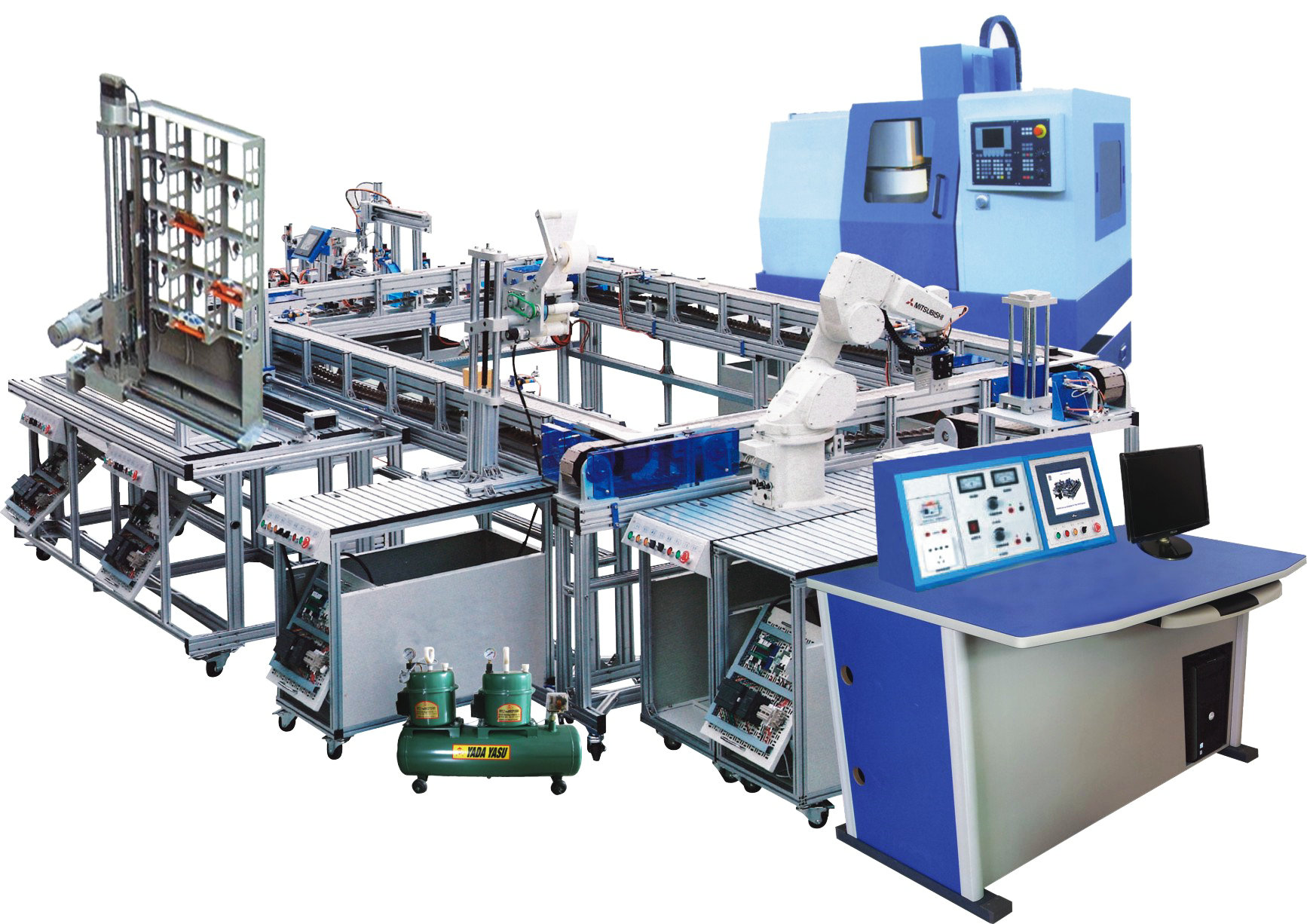 柔性生产制造实验设备是专门为职业院校、职业教育培训机构研制的FMS柔性生产实验系统,根据机电类、自动化类、先进制造类行业、企业中工业自动化应用的特点,对柔性制造技术的工作过程进行研究,对工业现场设备进行提炼和浓缩,并针对实验教学活动进行专门设计,融机、光、电、气,包含了PLC、机器人、传感器、气动、工业控制网络、电机驱动与控制、计算机等诸多技术领域,整个系统由MES生产管理系统、WINCC监控系统、主控PLC和下位PLC通过网络通讯技术构成一个完整的多级计算机控制系统,通过训练,使学生了解FMS的基本组成和基本原理,让学生全面掌握机电一体化技术的应用开发和集成技术,帮助学生从系统整体角度去认识。