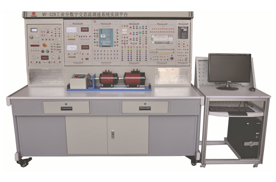 MY-32B型工业全数字交直流调速系统实训平台主要训练和考核学员对交流变频器和直流调速装置的参数设置和系统应用能力,通过对交流变频器控制电路和所控制电机负载的精心设计,使学员通过实训掌握交流电动机变频控制各种典型的工作状态;通过对直流调速装置主回路、控制回路和直流电动机负载的精心设计,使学员通过实训掌握直流电动机调速各种典型的工作状态。该设备同时增加了基于PLC及变频器、触摸屏的综合应用电路。由可编程控制器、模拟量模块、编码器、七寸彩色触摸屏、变频器、控制软件、交流接触器、按钮、指示灯、欧陆514C直流调速器(16A)等组成。