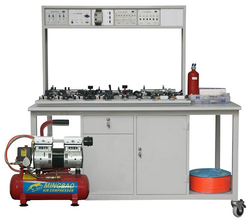 (二)气动元器件配备:(固定在元件配置板上)空气压缩机,空气过滤、减压、油雾器三联件,减压阀,手动换向阀,电磁换向阀,气控换向阀,行程阀,单向阀,节流阀、单向节流阀、快速排气阀,或门型梭阀,单作用气缸,双作用气缸、旋转气缸,行程开关(常闭、常开)等。