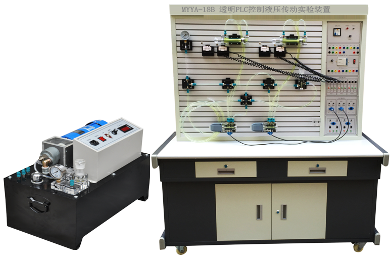 MYYA-18B 透明PLC控制液压传动实验装置(外泵站)是根据《液压传动》《液压原理》《机械基础》等教材内容要求和国内液压元件特点,由控制回路,压力控制回路,速度控制回路,顺序控制回路等基本功能回路组成。本演示系统通过对以上四大基本功能的十八种基本控制回路的实验演示,使学生能熟识常用液压元件的结构,性能及用途,掌握十几种基本回路的工作过程及原理,提高学生故障处理及解决问题的能力,在实验演示中得到启发,引发兴趣,利用它可以对本产品所提供的各种元件容限内的其它油路进行实验。