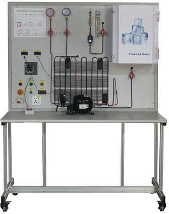 实训台提供1/9匹冰箱制冷压缩机QD60(85W0.65AR12)、直冷式蒸发器(铝复合板吹胀式蒸发器及下蒸发器、钢丝式冷凝器(17档)、冷凝风扇照明灯及门开关双金属片热保护继电器、PTC启动器、重锤启动器、毛细管。