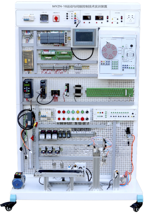 MYZN-18运动与伺服控制技术实训装置主要由网孔实训屏和自动化部件组成,集成西门子现场总线与工业以太网课程而研发的教学系统,基本覆盖了当今自动化的各种控制方式:常规的电气技术实训PLC实训、变频技术实训、智能控制技术实训、工业控制网络实训等。