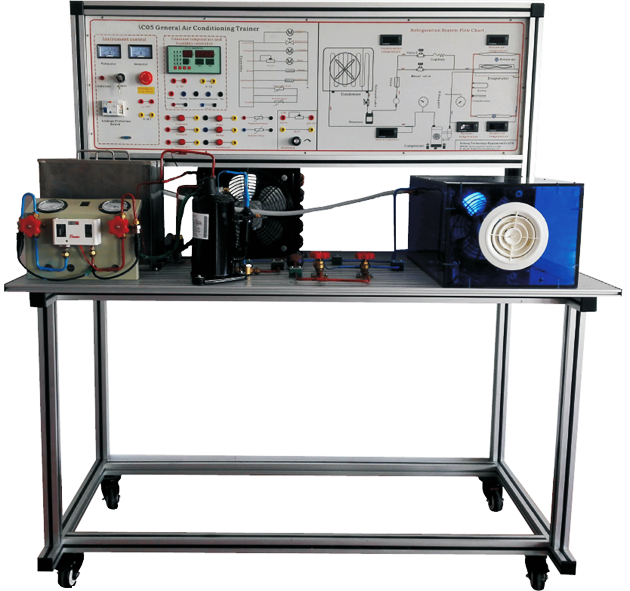本装置是采用直流式空气处理系统,并配置压缩机、风冷冷凝器、蒸发器、加湿器、电加热器和风管等真实部件,可测量压力、温度、湿度等过程参数。通过对本装置的实验,能使学生熟悉直流式系统的空气处理过程,并得到热工测量和计算的基本训练。本装置适用于“制冷空调原理及应用”、“制冷空调技术”、“建筑电气控制技术”等课程的实验教学。