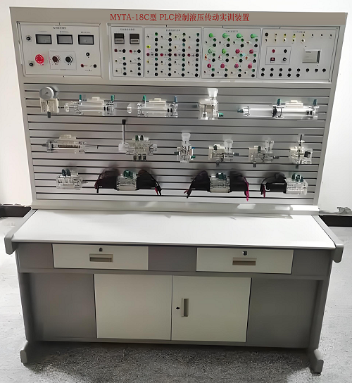 1、液压传动与PLC控制实训装置主要由实训桌、实训台、液压元件和电器控制器件、可编程控制器(PLC)等器件组成。