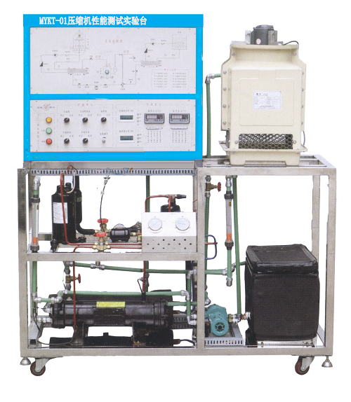 MYKT-01F制冷压缩机性能实验台(数据采集型)-采用蒸汽压缩式制冷循环系统,配备全封闭式制冷压缩机、冷凝器、蒸发器等制冷系统真实部件,并设有智能温度调节仪、流量计、压力表、电压表、电流表等测量仪表。不但能开设制冷压缩机性能参数的测定实训,还能进行制冷循环基本原理的演示实训。适用于职业院校制冷专业相关课程的教学实训。
