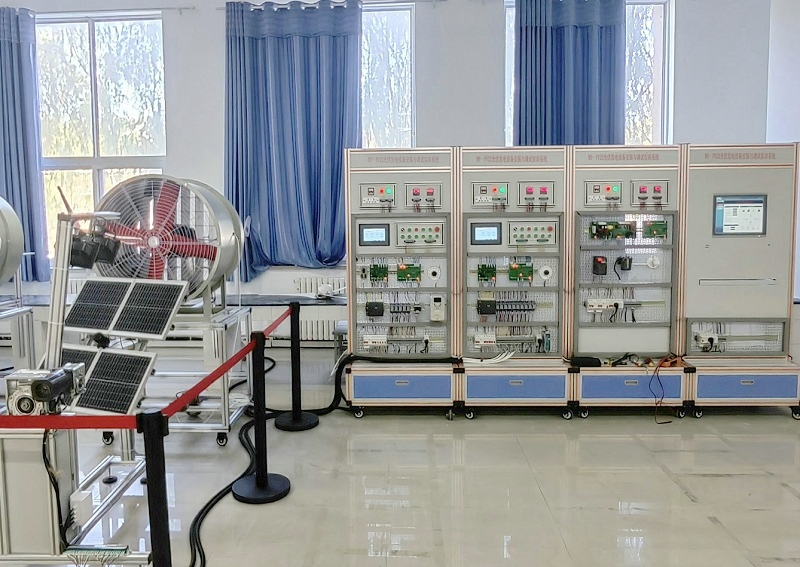 实训装置由光伏供电装置;光伏供电系统,风力供电装置,风力供电系统、逆变与负载系统、监控系统组成,系统采用模块式结构,各装置和系统具有独立的功能,可以组合成光伏发电实训系统、风力发电实训系统。