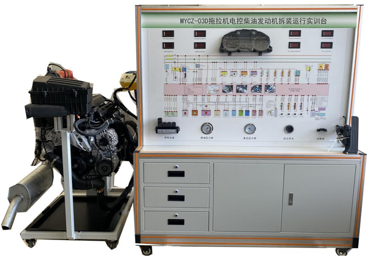 MYCZ-03D拖拉机电控柴油发动机拆装运行实训台(博世2.8T)采用 翻新 拖拉机 电控柴油发动机总成(博世2.8T,易于拆装)的拆装翻转台架和运行检测控制台两部分组成。拆装翻转台架提供学员进行发动机拆卸和装配实训。装配好发动机后与运行检测控制台对接,可起动运行发动机,检测发动机的装配效果。