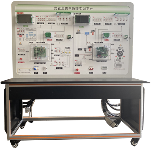2、交流充电桩配套漏电保护器、集成式充电控制模块、刷卡模块、充电状态指示灯、急停开关、交流充电器等实物。面板喷绘有交流充电原理示意图和充电桩标准参数值,可与实物配套进行充电原理教学训练;