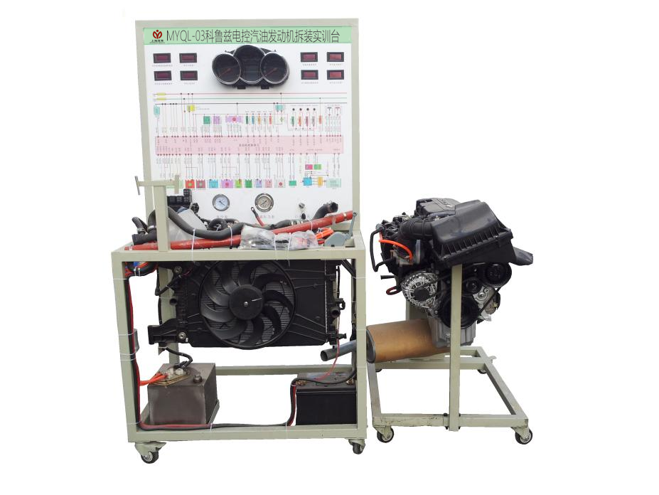 拆装翻转台架由电控汽油发动机总成和可做360度翻转的发动机拆装架组成,运行检测控制台由控制面板、发动机电控单元、冷却系统、供油系统、蓄电池等组成;