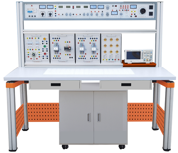 装置由主机箱、实验桌(装有九孔万能插件板)、实验挂箱支架、移动矮柜、示波器架、透明创新实验模块、学生凳等组成。实验装置支架与实验桌可组合、可拆装。支架与桌脚一体,铝合金结构。电气控制实验挂箱、各实验模块可根据实验需求自由组合实验。