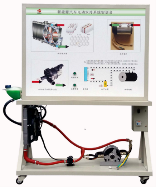 检测控制面板(装有各种检测端子以及彩色电路图)、电子水泵、电池冷却器与付水壶、水管、点火开关、水温传感器/温度信号模拟装置、模拟水冷散热系统控制装置、电子风扇与继电器、电池箱、DC12V装置、一体化全铝合金型材搭建的移动台架(1500×700×1700mm 带自锁脚轮装置,带安装检测端子的原理面板,面板1448×940mm)、设备操作说明书。