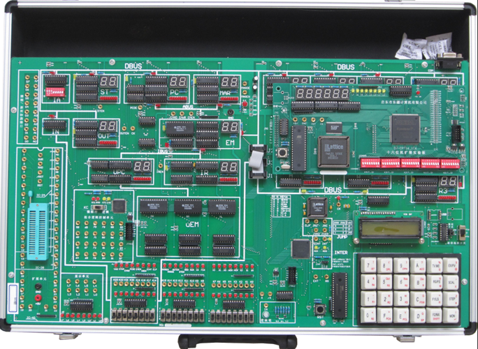 实验主板有:累加器A,暂存器W,运算器ALU,直通D/左移L/右移R单元,寄存器组R0—R3,中断向量IA,堆栈ST,程序计数器PC,地址寄存器MAR,输入IN,输出OUT,存贮器EM,微地址UPC,指令寄存器IR,微程序控制器uEM,组合逻辑控制单元,三总线接口,40芯锁紧扩展座、二进制开关电平输出/显示,逻辑笔、管理单片机89S52、4×6键盘,字符式LCD,RS232/USB通讯接口,* CPT16十六位机扩展接口,通信选择开关。