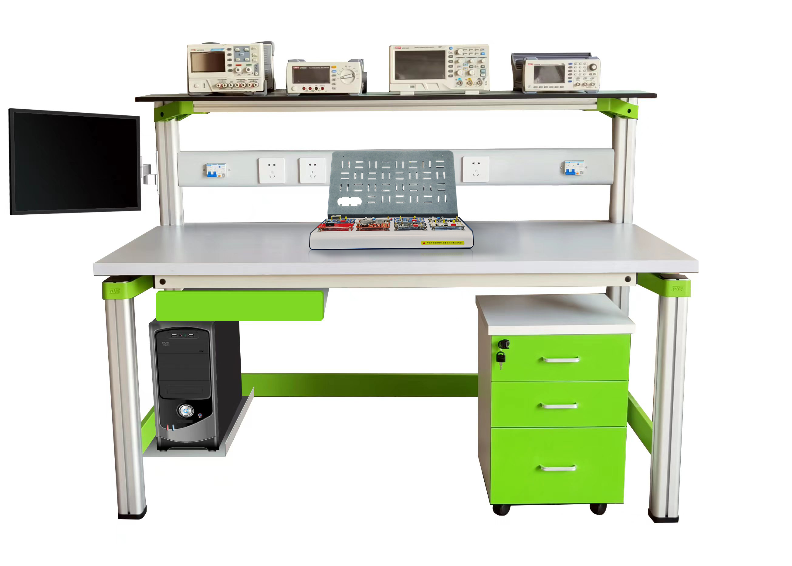 实训桌规格为1600(长)*700(宽)*1150(高),设有一个键盘托一个抽屉,桌子下部靠后右边有一个电脑主机箱托。实验桌主体结构全部采用高性能表面氧化的铝型材及一次成型铝压铸框架连接构件,连接构件采用压铸成型工艺(非焊接工艺),经机加工、抛丸、喷砂,表面静电喷涂工艺,安装方便、快捷,用户可自行DIY组装。桌体立柱采用工业铝型材成型工艺,表面氧化处理,截面尺寸:70mm×70mm,四面带槽,槽宽约8mm,端部装有注塑成型配套塑料堵头。桌面采用25mmE1级三聚氰胺饰面板,桌面板下设支撑框架,承受力不少于300kg。配备储存柜,存放元件及工具,储存柜底部4只高强度万向可制动PU脚轮,方便移动。实训装置整体简约不简单,高端大气,符合现代化产品审美和发展趋势。