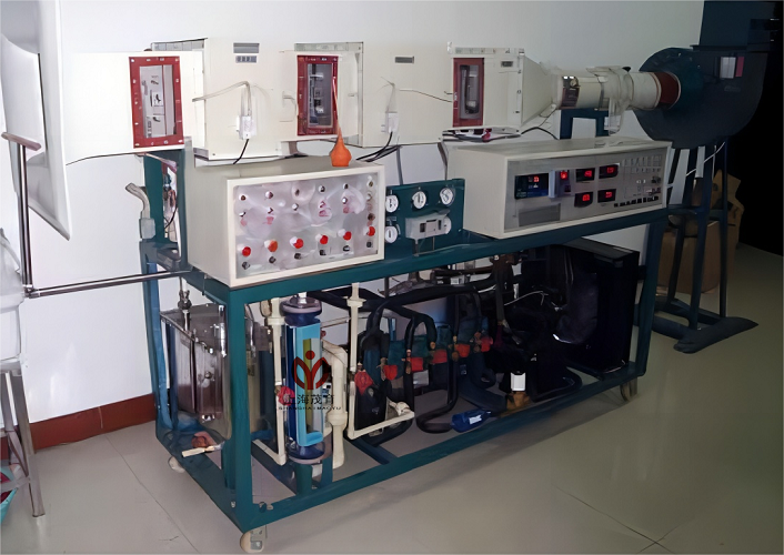 制冷压缩机组,冷凝器,蒸发器,离心风机,电热加湿装置,一次、二次加热装置,数显温度仪表,压差计(±100),超压保护装置,压力表(-0.1-2.5 Mpa),转子流量计,热电偶,电流表,电压表,风量测量装置(笛形管),不锈钢台架及控制屏等。