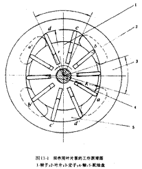叶片式转向油泵按其转子叶片每转供油次数和转子轴的受力情况可以划分为单作用非卸荷式和双作用卸荷式两大类。北京切诺基吉普车采用双作用卸荷式叶片油泵,如图所示,由转子1、叶片2、定子3、轴4、配油盘5和壳体等机件组成。