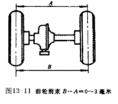 所谓前束是指两前轮轴前轮距A小于前轮轴后轮距B的差值。其标准前束值为B-A=0-3毫米,如图所示。