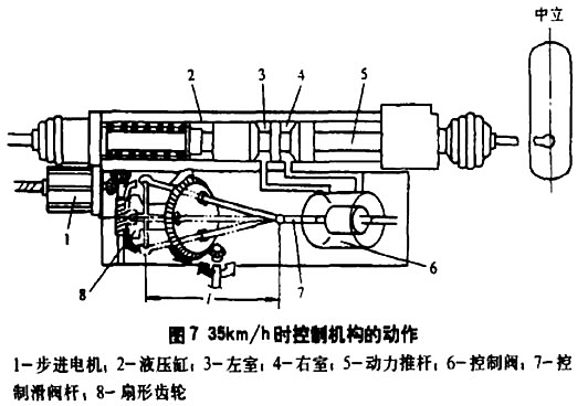 图b)所示为汽车转向时的情况。转向盘转动分配阀中央的扭杆弹簧3和转阀2,再通过扭杆弹簧带动阀体和转向机螺杆,由于转向阻力的作用,使扭杆弹簧发生扭转,造成阀体相对于转阀转过了一个角度,这样就使进油口进入的压力油只能流向转阀和阀体纵槽槽肩处间隙变大的一边,并通过阀体上的出油口流向接通了的动力缸的一侧腔室,此时动力缸的另一侧腔室就与进油口隔绝,其中的油液通过阀体内另一组纵槽槽肩处间隙变大的另一边,与转阀的回油孔相通,形成了泄压通道。这样就造成了齿条--活塞的一侧受到压力油的作用,而另一侧处于泄压状态,这种压力差就造成了助力作用。